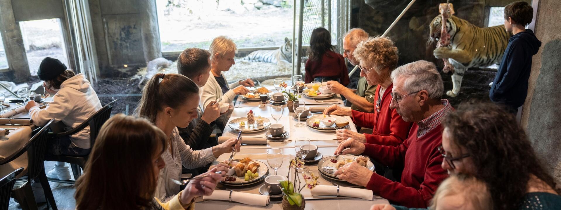 Ein Brunch im Walter Zoo ist alles andere als gewöhnlich. Denn Sie können im Zoorestaurant und zwischen April und Oktober in der Tigerhöhle (je nach Anzahl Reservationen) unsere Tiere durch die Glasscheiben beobachten.